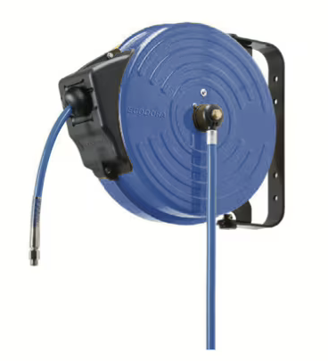 Enrouleur automatique à cliquet Tambour fermé Carter acier peinture époxy équipé de 12 mètres de tuyau PU polyuréthane tressé vernis AIR/EAU Ø 10×14 -20 bar + 50°C – Raccordements: Entrée Mâle G 3/8 -Sortie tuyau: mâle G 3/8 – Livré avec support pivotant et flexible d’alimentation de 1.5 m -Débit AIR= 700 L/MN -Débit EAU: 30 L/MN -Norme ATEX 94/9: EXII 3 GD c X