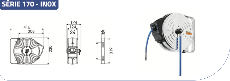 Enrouleur automatique à cliquet INOX Tambour fermé équipé de 20 mètres de tuyau PU tressé bleu alimentaire pour AIR / EAU/ DETERGENTS/ LIQUIDES ALIMENTAIRES/ GASOIL Ø 8×12 – 20 bar +70°C – Raccord tournant en inox AISI304/Delrin + joints VITON/FKM -Raccordements INOX AISI304 : Entrée : Mâle G 3/8 -Sortie tuyau : Mâle G 1/4- Support pivotant inox + flexible alimentation de 1.5 mètre – Norme ATEX 94/9 : EX II 3GD c IIB TX